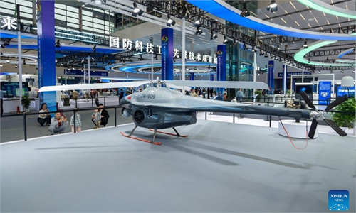 An FH-909 unmanned helicopter is displayed during the 13th China (Mianyang) Science and Technology City International High-Tech Expo in Mianyang, southwest China’s Sichuan Province, Sept. 27, 2025. The expo opened here on Friday and will last until Sept. 30, with a core exhibition area of 32,000 square meters for science and technology which focuses on electronic manufacturing technology, new display technology, AI technology and low-altitude economy. (Photo: Xinhua)