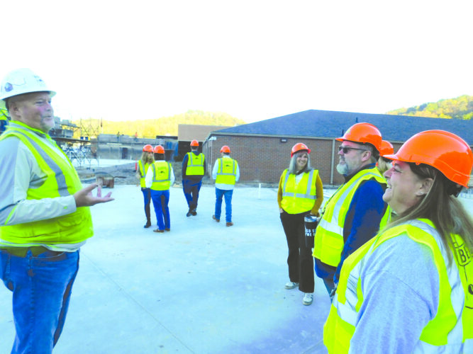 Site supervisor Bill Reed, left, guides Bridgeport Exempted Village School District teachers and staff on a tour of the construction site of the upcoming multipurpose facility “The Bridge.” Staff walked the site as part of a training day. Reed is pictured speaking with fourth grade teacher Kelli Hilt.