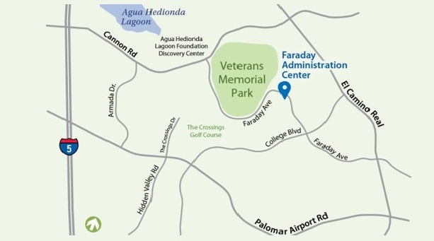 Located along the north side of Faraday Avenue east of Cannon Road, the rolling terrain has sweeping view of Agua Hedionda Lagoon and the Pacific Ocean.