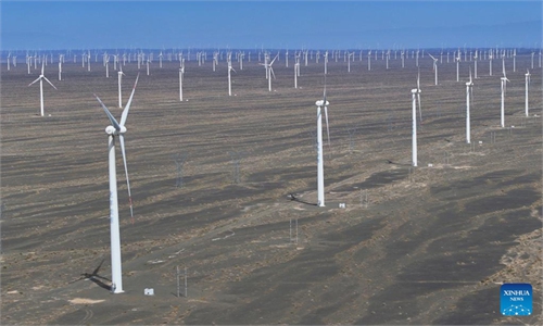 An aerial drone photo taken on April 27, 2025 shows a view of the Santanghu wind power farm in Hami City of northwest China’s Xinjiang Uygur Autonomous Region. Xinjiang, a region rich in solar and wind energy resources, has vigorously developed the new energy industry in recent years, accelerating the construction of large-scale wind and photovoltaic power base projects. A 750-kilovolt (kV) “power expressway loop,” the country’s largest of its kind, has taken shape throughout Xinjiang, providing strong support for efficient energy allocation. (Photo: Xinhua)