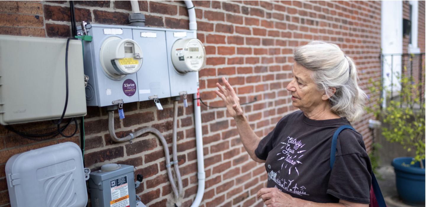 In the steep hills above the Schuylkill River, across the street from a famous cheesesteak place and at the end of a quiet block, sits a typical Philadelphia rowhouse: narrow brick, front porch, fig trees growing in the yard. From the sidewalk, there’s nothing to distinguish this house from its neighbors. But there’s a tiny clue that something is a little different: a sticker on the electric meter with a Solarize Philly logo.