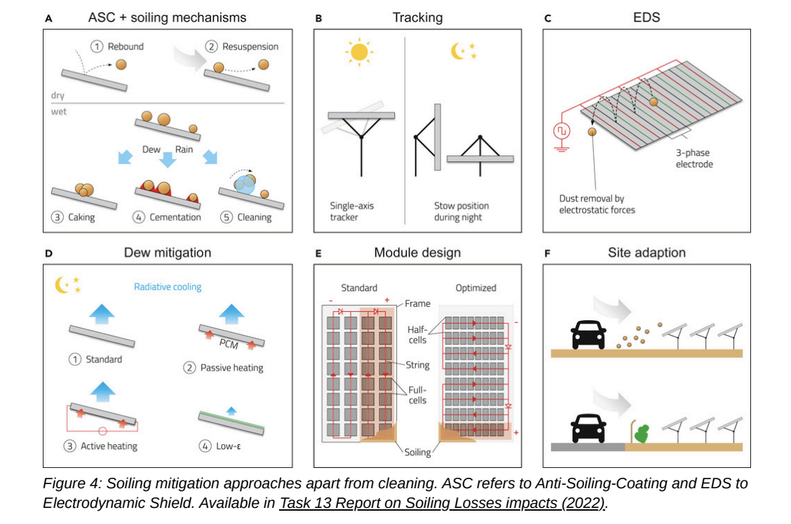 The fact sheet says there is no one size fits all solution to soiling, advising that mitigation strategies must be tailored to local conditions and site characteristics. While cleaning is outlined as the most common solution for soiling, IEA-PVPS advises that soiling mitigation should begin before operation through the adoption of soiling prevention measures and designs that facilitate cleaning operations.