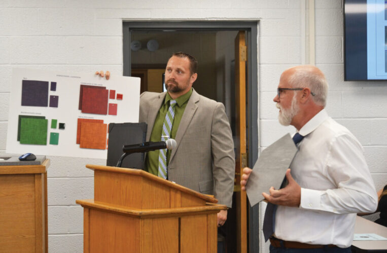 Kaleb Lawrence, assistant superintendent of operations for Wood County Schools, holds up an example of colored floor titles proposed for the new Lincoln elementary during the Aug. 14 meeting of the Wood County Board of Education as Ryan Taylor, CEO of Pickering Associates, explains their usage. Taylor said Tuesday the team would have to change some of the building material now to help with the rising cost of the project. (File photo)